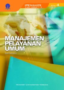 Buku Materi Pokok (BMP) IPEM4429 Manajemen Pelayanan Umum bertujuan memberikan bekal pengetahuan dan keterampilan bagi para mahasiswa dalam mempelajari semua aspek yang berkaitan dengan manajemen pelayanan. Mata kuliah Manajemen Pelayanan Umum membahas tentang konsep dan pengertian umum, lingkup dan corak pelayanan publik, perkembangan teori birokrasi dan pelayanan publik, manajemen pelayanan publik, pelayanan prima, mengelola sumber daya manusia dalam pelayanan, etika dan Trofesionalisme pelayanan publik, serta teknologi informasi dan pelayanan publik.