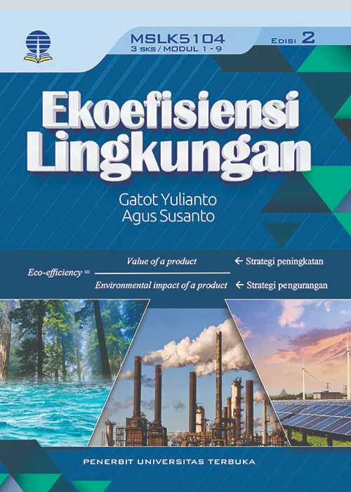 Buku Materi Pokok MSLK5104 – Ekoefisiensi Lingkungan ini disusun untuk membantu And a dalam memahami materi yang terkait dengan pembangunan ekonomi yang menyisakan problem lingkungan dilihat dari makin menipisnya cadangan (stock) sumberdaya alam dan pencemaran lingkungan. lsu menipisnya sumberdaya dan pencemaran dalam skala lokal, nasional dan global menjadi keprihatinan bangsa-bangsa di dunia, sehingga pembangunan berkelanjutan yang ditunjukkan dalam SDGs menjadi acuan rencana pembangunan bangsa-bangsa. Konsep ekoefisiensi diterapkan sebagai suatu metrik-pengukuran kinerja perusahaan terhadap lingkungan (skala mikro) serta kondisi perekonomian (skala makro) baik dalam level lokal, regional, nasional dan sub kawasan regional maupun sektoral (misalnya industri, pertanian dan transportasi). Elemen penting dalam ekoefisiensi adalah nilai suatu output (value) (misalnya nilai penjualan, PDRB, PDB) dan dampak lingkungan dari unit output yang dihasilkan (misalnya C02 dan lim bah anorganik cair), sehingga strategi yang dilakukan adalah meningkatkan kualitas produk dan meminimalisasi dampak lingkungan.