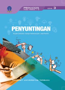 Buku Materi Pokok (BMP) PBIN4325 Penyuntingan Mata kuliah ini membahas tentang hakikat dan ruang lingkup penyuntingan tugas dan tanggung jawab guru sebagai penyunting rambu-rambu penyuntingan latihan penyuntingan wacana/naskah tulis dan lisan serta seluk beluk penyuntingan. Untuk mengukur kompetensi mahasiswa di setiap kegiatan belajar terdapat latihan berbentuk essay dan tes formatif berbentuk objektif.
