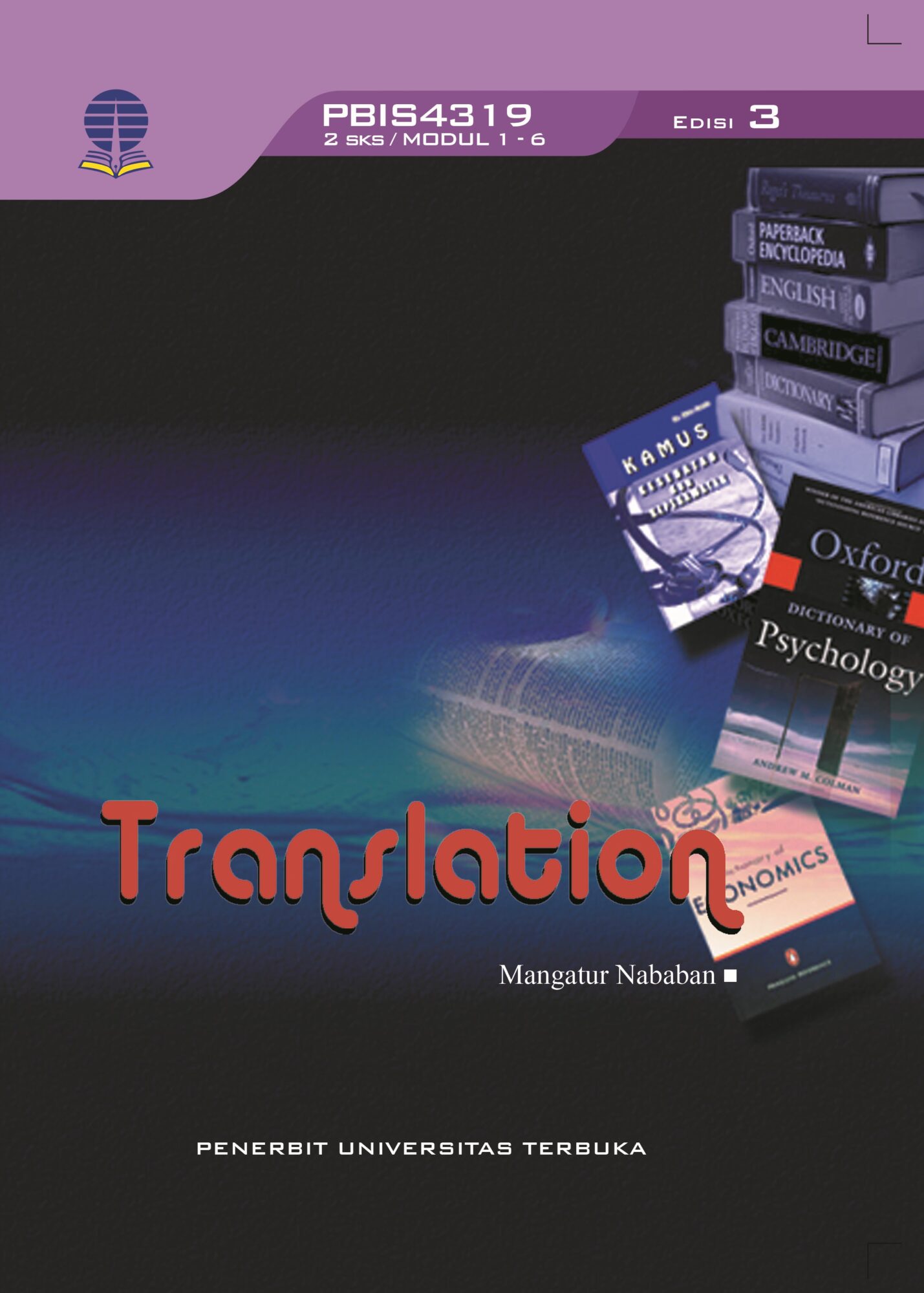 Buku Materi Pokok (BMP) PBIS4319 Translation ini berisi uraian tentang pengantar penerjemahan, proses dan kompetensi penerjemahan, jenis-jenis makna dalam penerjemahan, parameter terjemahan yang berkualitas, ideologi, metode dan teknik penerjemahan, penerjemahan pada tataran mikro, dan penerjemahan pada tataran makro. Materi-materi BMP tersebut disajikan sebagai bahan belajar bagi mahasiswa S1 Program Studi Pendidikan Bahasa Inggris atau bagi siapapun yang tertarik untuk belajar penerjemahan agar memiliki kompetensi penerjemahan.