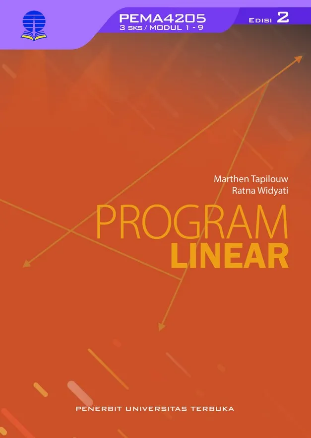 Buku Materi Pokok (BMP) PEMA4205 Program Linear Mata kuliah ini berisi formulasi masalah program linear, menyajikan masalah menggunakan model matematika dimana terdapat unsur: fungsi linear sebagai tujuan, sistem pertidaksamaan linear sebagai kendala (batasan), dan variabel yang umumnya bernilai non-negatif sebagai pengetat. Dengan memperhatikan lingkup materi dan kompetensi umum mata kuliah, maka garis besar pokok bahasan yang disajikan adalah: model matematika suatu program linear, metode penyelesaian untuk memperoleh nilai optimal fungsi tujuan yang terikat pada pembatas dengan variabel non-negatif, dan penerapan perangkat komputer untuk menemukan penyelesaian optimal. Metode penyelesaian masalah dan prosedur yang diharapkan dapat Anda ketahui dan berusaha memahaminya adalah: metode grafik untuk kasus dua variabel pokok, algoritma simplex (baku, dua fase, dan direvisi) melalui penggunaan operasi matriks dan vektor. Kasus primal-dual dan sensitivitas dapat Anda pelajari melalui mata kuliah ini.