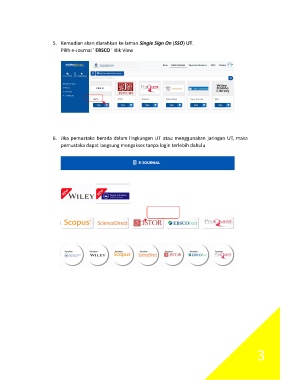 5. Kemudian akan diarahkan ke laman Single Sign On (SSO) UT. Pilih e-Journal ' EBSCO ' klik View 6. Jika pemustaka berada dalam lingkungan UT atau menggunakan jaringan UT, maka pemustaka dapat langsung mengakses tanpa login terlebih dahulu 3